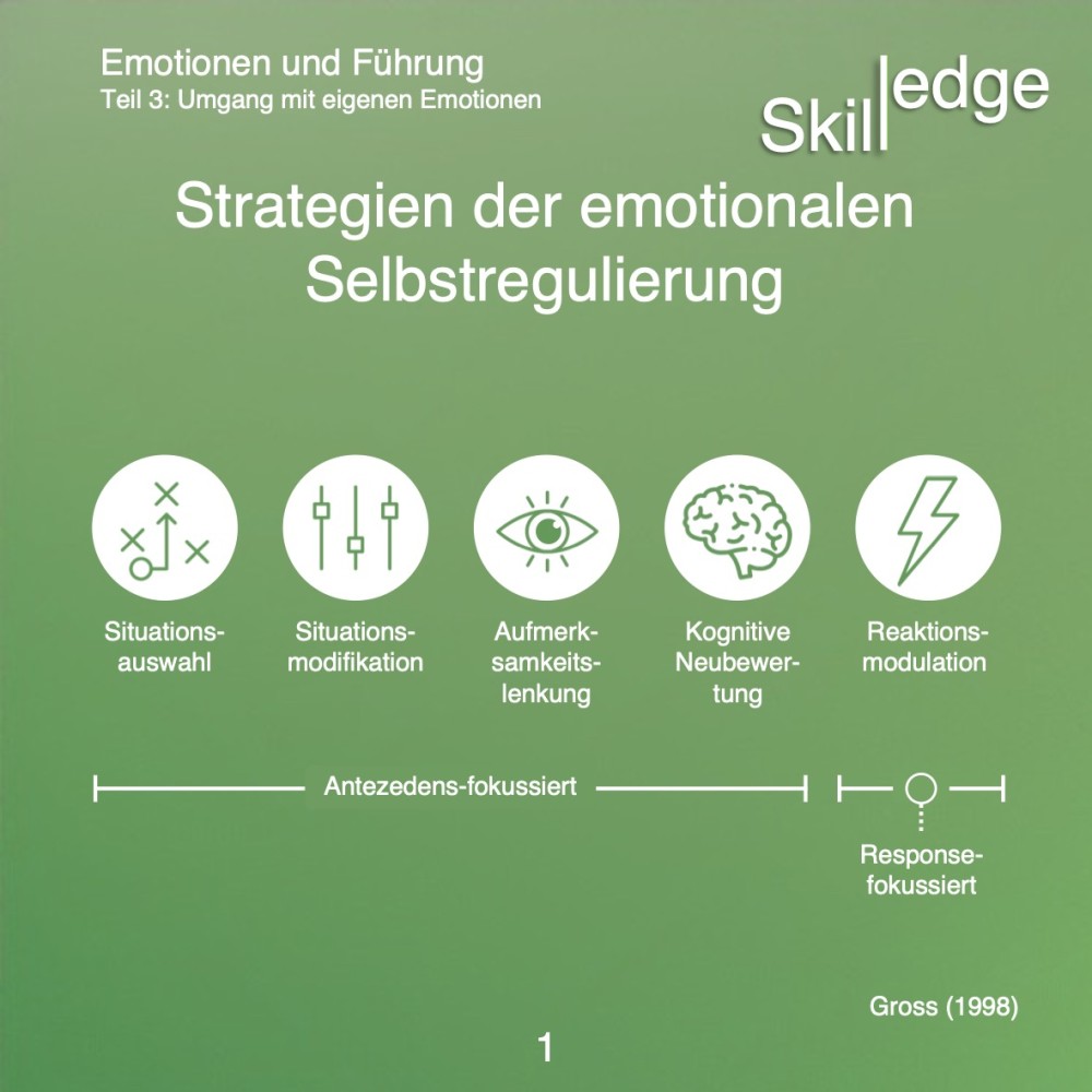 Es existieren mehrere Modelle, die emotionale Regulierung beschreiben. Ein gut etabliertes, prozessorientiertes Modell stammt aus der Emotionsforschung von James Gross (1998). Es beschreibt fünf Strategien der Emotionsregulation, die in antezedens-fokussierte (diese setzen früh im Emotionsprozess an, bevor die Emotion voll ausgeprägt ist) und eine response-fokussierte Strategie (nach dem Auftreten der Emotion) unterteilt werden.