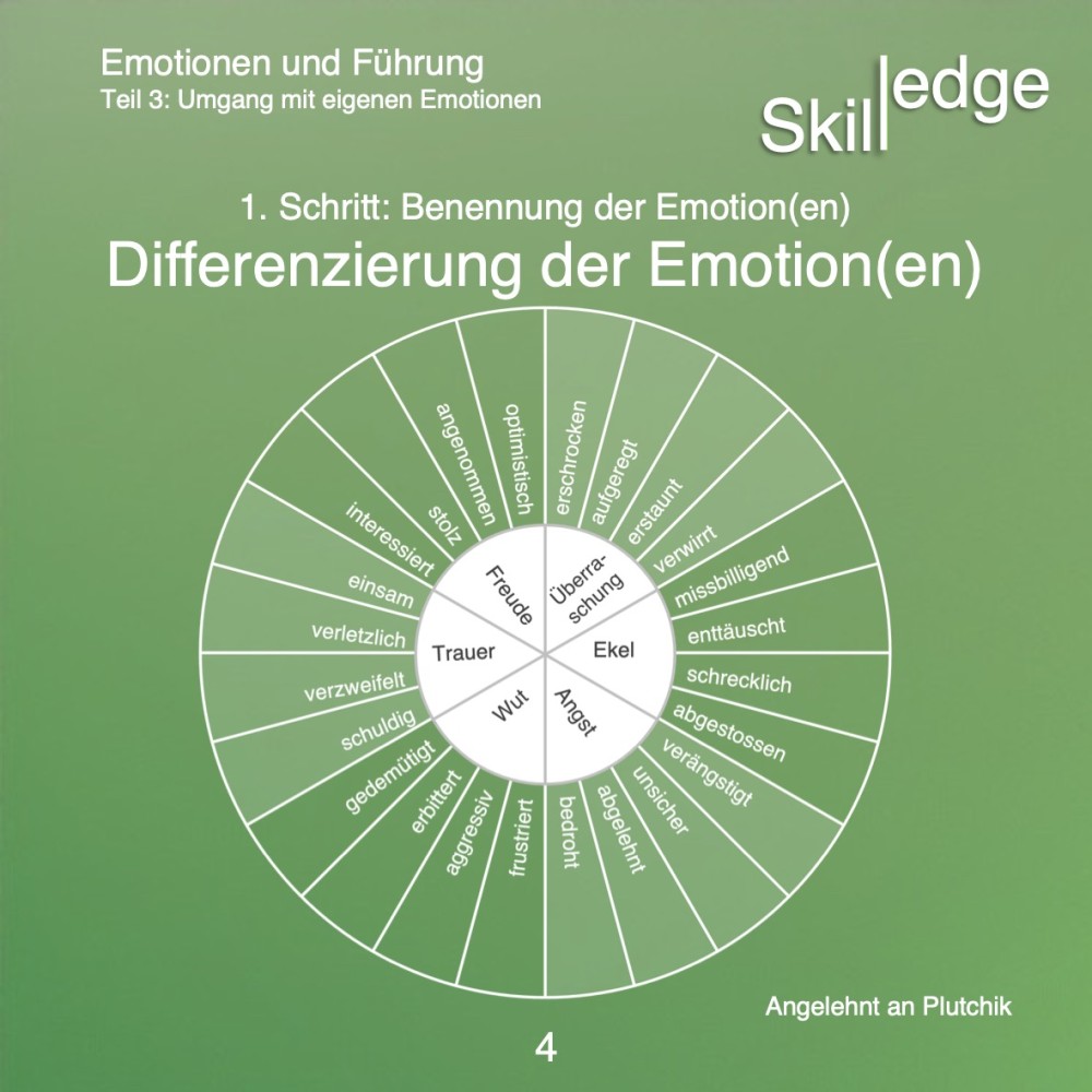 Wir machen im Alltag häufig die Erfahrung, dass viele Personen über die Benennung der Basisemotionen nicht hinausgehen (können). Diese fehlende Differenzierbarkeit kann uns jedoch in unserer eigenen Entwicklung behindern und auch dabei, andere besser zu verstehen. Im Englischen spricht man hier auch von „emotional illiteracy“. Einen Ansatz, die emotionale Differenzierbarkeit zu fördern, bieten Emotionsräder, welche an Plutchik (1980) angelehnt sind.