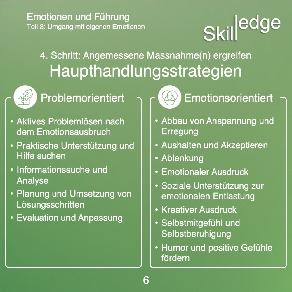 Im letzten Schritt geht es darum, bewusst zu handeln, statt reflexartig zu reagieren. Dies kann je nach Situation anders aussehen. Prinzipiell kann man zwei Arten von Strategien unterscheiden: